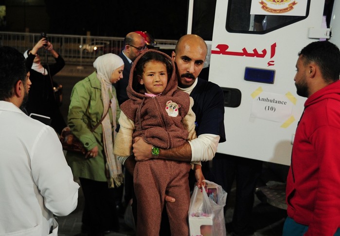 [프레스뉴스] 채정병 특파원=압둘라 2세 요르단국왕이 지난 트럼프 미국대통령과의 회담에서 밝힌 가자지구 어린이환자 2,000명에 대한 요르단 이송치료 첫번째 그룹(29명)이 4일(현지시간) 항공과 육로를 통해 요르단에 도착한 가운데 오른쪽 팔을 잃은 한 아이가 간호사에게 안겨 병원으로 들어가고 있다.