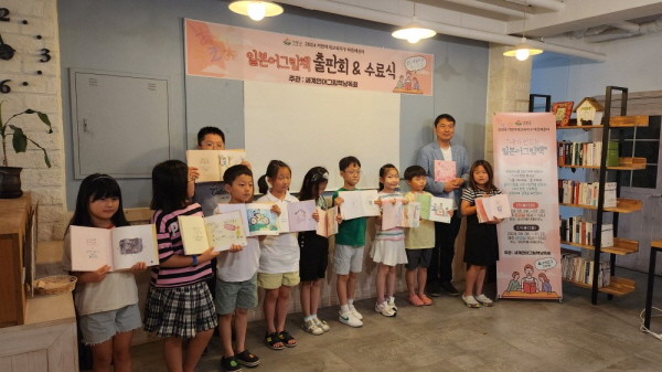 이날 발간된 책은 마을배움터 수업에 참여한 초등학생들이 일본 문자를 배워 ‘정말 좋아요’라는 주제로 직접 그림을 그리고 글자를 써 제작됐다.