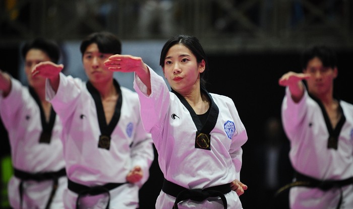 [프레스뉴스] 채정병 특파원=5일(현지시간) 요르단 암만에서 열린 국기원 시범공연에서 단원들이 절도있는 동작으로 공연을 펼치고 있다.