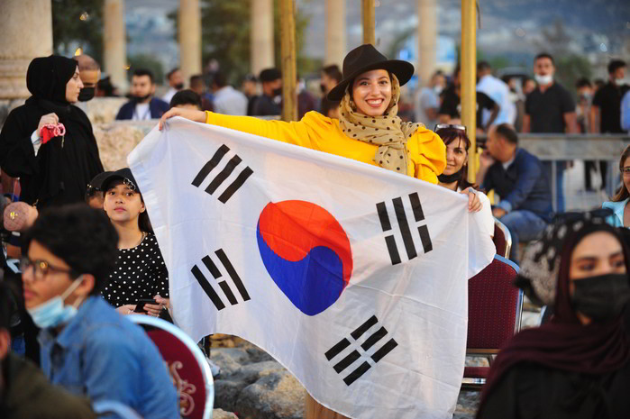 [프레스뉴스] 채정병 특파원=1일(현지시간) 세계적인 대한민국 비보이 그룹 진조크루의 요르단 특별공연이 제라쉬 페스티벌 야외무대에서 펼쳐진 가운데 한 요르단 여성이 태극기를 들어 보이고 있다.