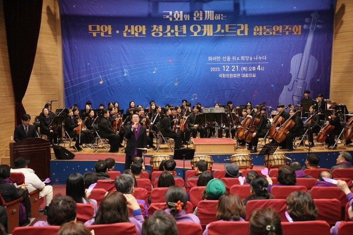 [전남=프레스뉴스] 강래성 기자= 신안군(군수 박우량)은 12월 21일 국회에서 신안군 1004 청소년 오케스트라단과 무안군 꿈의 오케스트라단 120여 명이 함께 특별한 합동 연주회를 했다