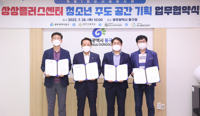 이날 협약식은 임택 동구청장, 진정준 광주고등학교장, 박형주 광주청소년삶디자인센터장, 문수영 광주청소년활동진흥센터장이 참석한 가운데 상상플러스센터 조성에 있어 기획 단계부터 청소년들의 의견과 아이디어가 적극 반영될 수 있도록 각 기관이 상호 협력하기로 했다.