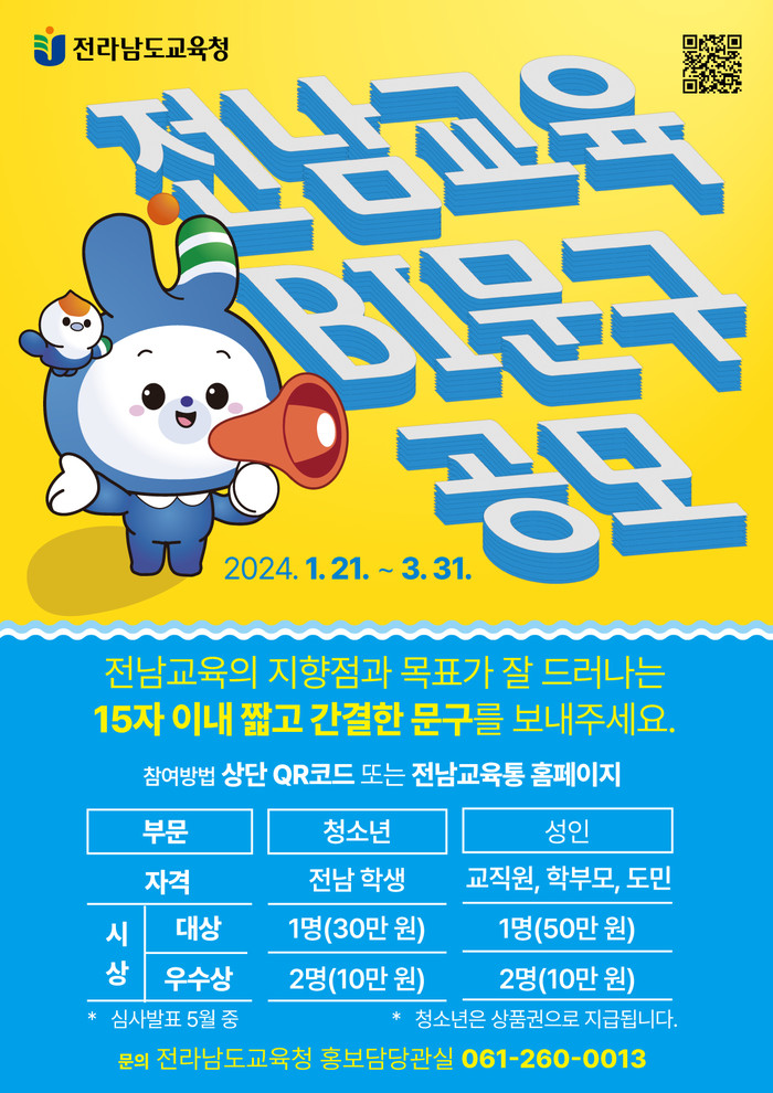 전남교육 구성원들의 참여를 통해 전남교육의 정체성을 확립하고 가치를 제고하기 위해 마련된 이번 공모전은 청소년과 성인 부문으로 나뉘어 진행된다. 전남 소재 학교의 소속 학생과 학교밖 청소년은 청소년 부문에 참여할 수 있으며, 전남교육청 소속 교직원을 비롯해 학부모, 도민은 누구나 성인 부문에 참여 가능하다.