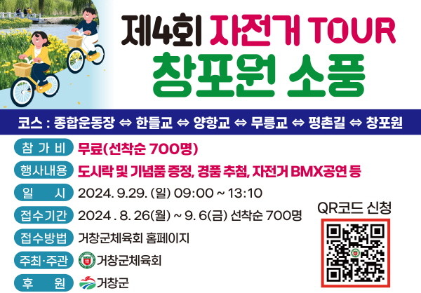한편, 제4회 자전거 투어의 참가자는 700명을 모집한다. 참가자 모집과 신청 문의는 거창군체육회(☎940-3927)으로 하면 된다.