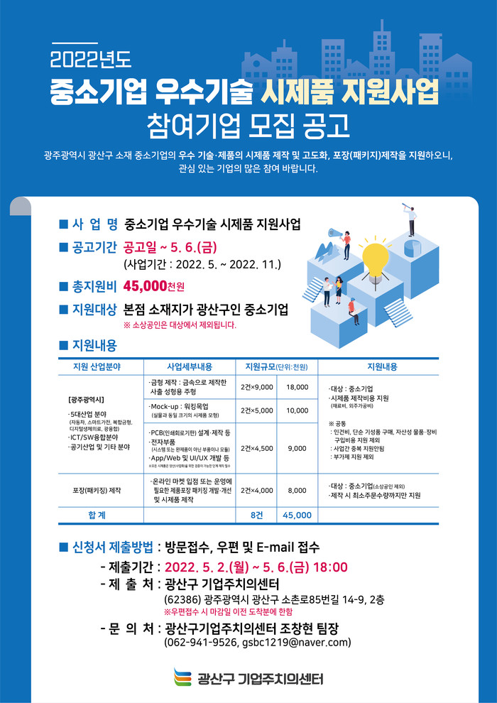 대상은 본점 소재지가 광산구인 중소기업(소상공인 제외)으로, 참여 신청은 5월6일까지 광산구 기업주치의센터에서 방문 또는 우편(62386, 광주 광산구 소촌로 85번길 14-9, 2층), 이메일로 접수한다.