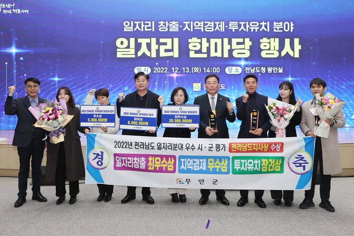 무안군은 이번 시상식에서 일자리창출 최우수상, 지역경제 활성화 우수상, 투자유치 장려상 등 모든 분야에서 수상했고, 전 분야 수상 시·군은 무안군과 영광군이 유일하며, 일자리창출 및 지역경제 활성화 분야는 작년에 이은 2년 연속 수상이다.