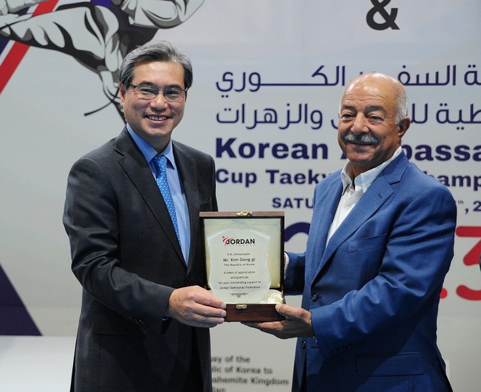 [프레스뉴스] 채정병 특파원=5일(현지시간) 요르단 암만에서 열린 국기원 시범공연 후 딥 쿠르디(오른쪽) 요르단태권도연맹 부회장이 김동기 주 요르단 대사에게 감사패를 전달하고 있다.
