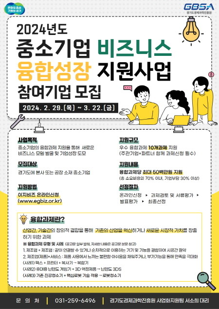 경기도는 이런 내용을 담은 ‘2024년 경기도 중소기업 비즈니스 융합성장 지원사업’을 추진하기로 하고, 참여희망 중소기업을 오는 22일까지 모집한다고 6일 밝혔다.