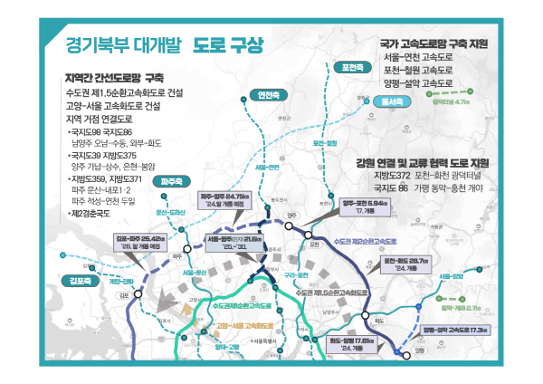 경기도는 서울~연천, 포천~철원, 서울~양주 등 고속도로 조기 착수를 지원하고, 포천~화천 광덕터널, 가평 동막~홍천 개야 등 강원도 교류 협력도로를 추진해 경기북부가 중심이 되는 광역도로 연결로 서울시와 강원도와의 연결성을 강화할 계획이다.