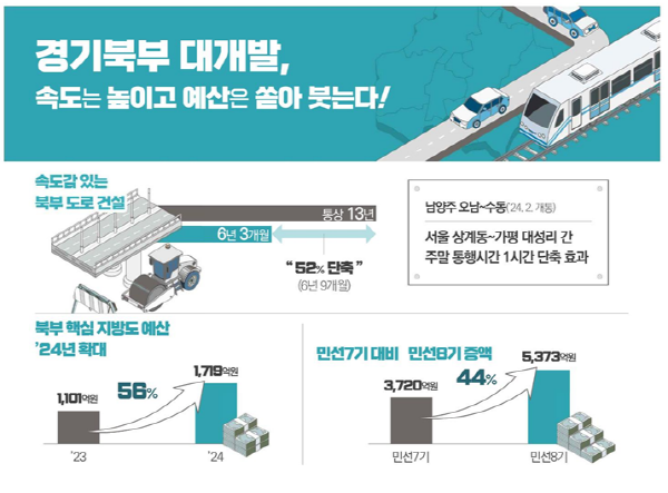 민선8기 경기북부 핵심지방도 예산은 5,373억 원으로 민선7기(3,720억 원)에 비해 약 1.4배로 크게 늘어 났다. 특히 경기북부 대개발 발표 이후인 2024년에는 전년(1,101억 원)보다 56% 증액된 1,719억 원을 편성해 경기북부 도로망 확충에 더욱 속도를 내고 있다.