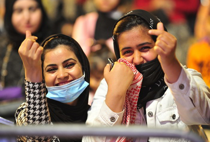 [프레스뉴스] 채정병 특파원=1일(현지시간) 세계적인 대한민국 비보이 그룹 진조크루의 요르단 특별공연이 제라쉬 페스티벌 야외무대에서 펼쳐진 가운데 관객들이 카메라를 향해 손가락 하트를 보이고 있다.