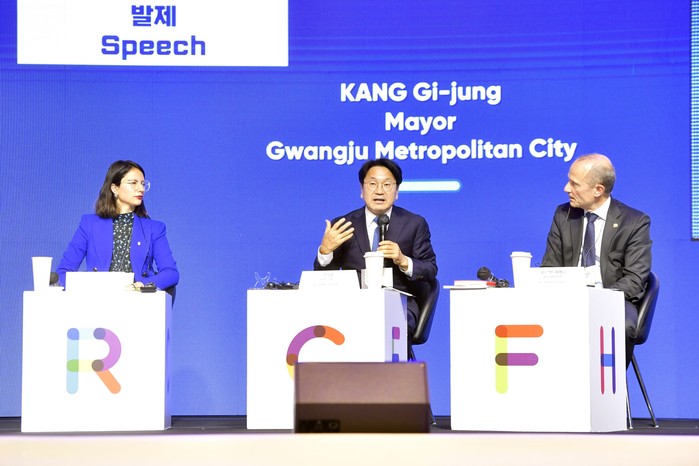 ‘인권도시와 기후정의’를 주제로 발제에 나선 강기정 광주광역시장은 “기후위기에 맞서는 인권도시의 철학과 정책은 보다 엄정해야 하고 이를 ‘기후정의’라 생각한다”며 “기후위기가 불러온 위험으로부터 모든 구성원이 평등하게 보호받을 수 있는 권리, 기후위기의 책임을 정의로운 전환의 관점에서 공정하게 배분하는 것이 중요하다”고 말했다.