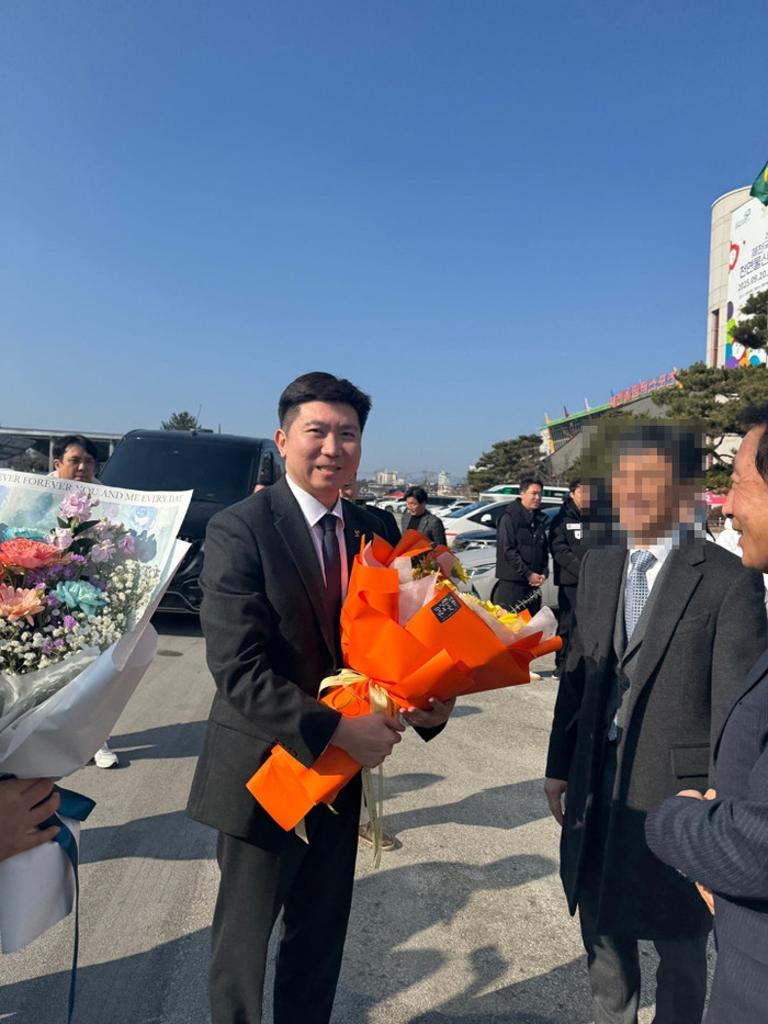 | ▲대한체육회 유승민 회장이 지난 1월18일 당시 당선인 신분으로 탁구 국가대표 1차 선발전 선수들을 격려하기 위해 제천을 방문해 ‘조폭간부’ 출신 시체육회장과 환영 꽃다발을 들고 환하게 웃고 있다. |