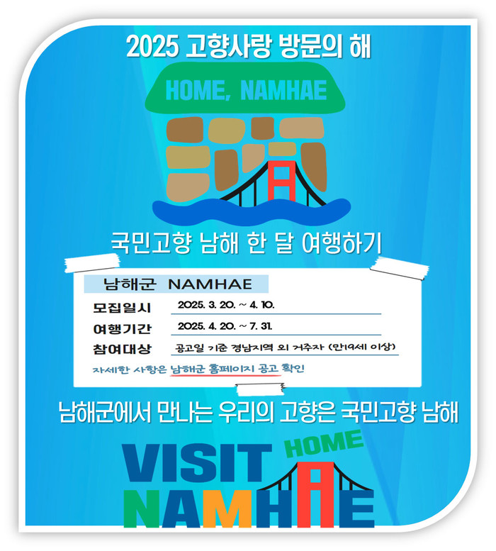 이연주 관광진흥과장은 “2025 고향사랑 방문의 해를 맞아 한 달 여행하기를 통해 많은 분들이 남해군과 인연을 맺을 수 있는 계기가 되었으면 한다”고 밝혔다.
