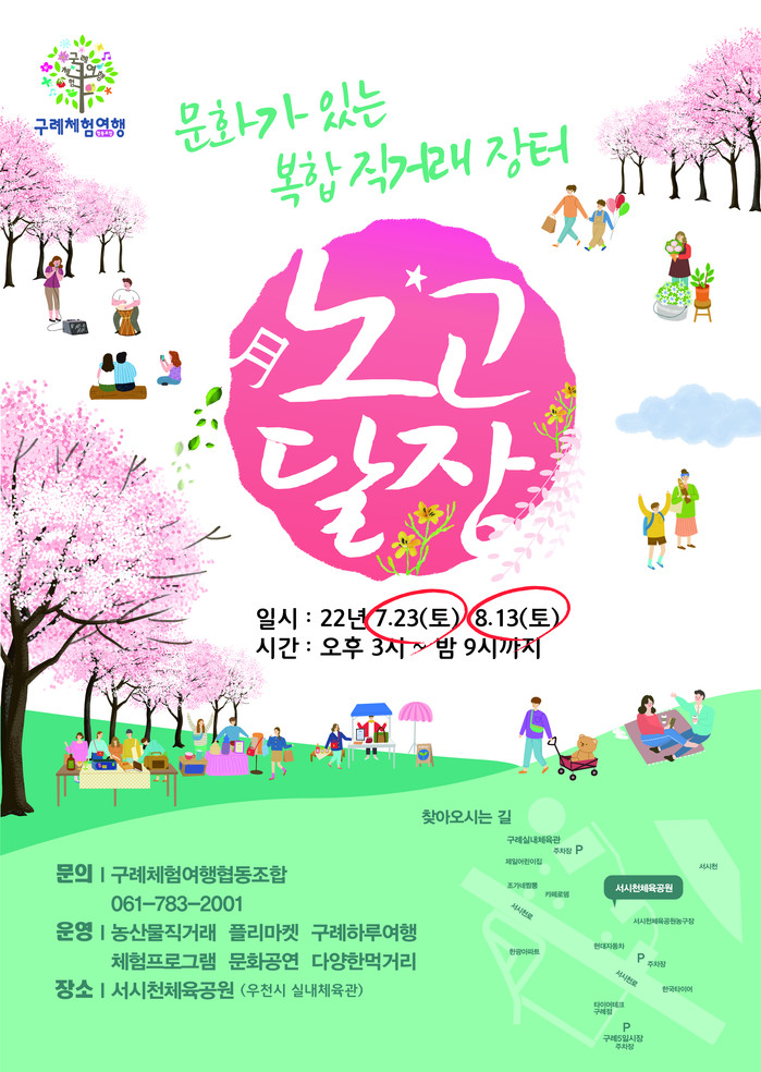 [전남=프레스뉴스] 강래성 기자= 전남 구례군이 문화공연을 연계한 농·특산물 직거래장터 ‘노고달장’을 오는 23일 오후 3시부터 9시까지 서시천체육공원에서 개장한다.