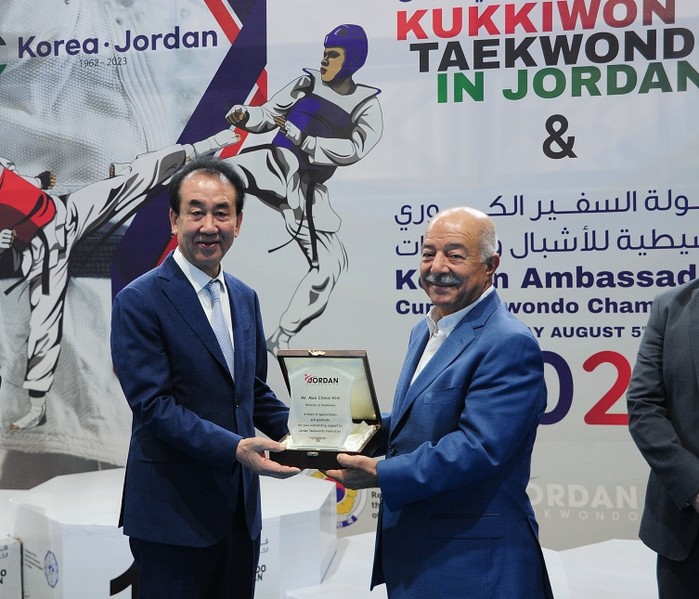 [프레스뉴스] 채정병 특파원=5일(현지시간) 요르단 암만에서 열린 국기원 시범공연 후 딥 쿠르디(오른쪽) 요르단태권도연맹 부회장이 김무천 국기원 이사에게 감사패를 전달하고 있다.