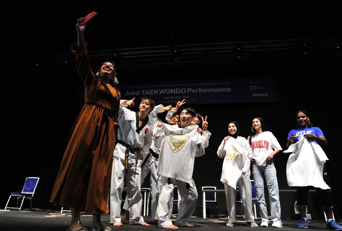 [프레스뉴스] 채정병 특파원=26일(현지시간) 한-요르단 수교 60주년을 기념하는 양국 공동 태권도 공연 행사가 암만 후세인 스포츠시티에서 열린 가운데 한 요르단 관객이 우리나라 K-타이거즈 공연단과 셀카를 찍고 있다.