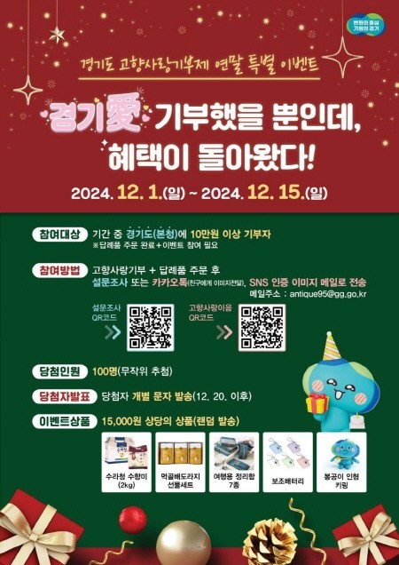 정구원 경기도 자치행정국장은 “연말정산 시기를 앞두고 고향사랑기부제의 인지도를 높여 기부문화를 확산하기 위해 이벤트를 준비했다”면서 “세액공제나 답례품 외 추가 혜택이 제공되는 만큼 많은 참여를 바란다”고 말했다.