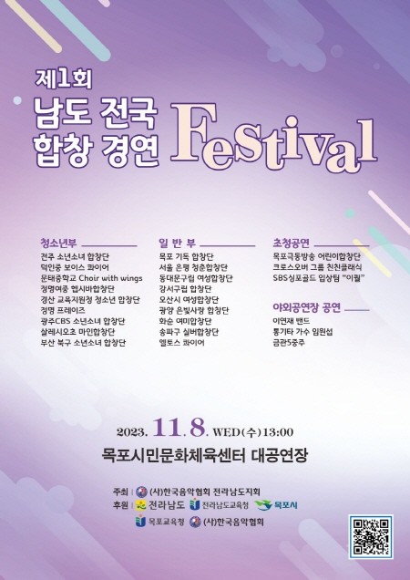 [전남=프레스뉴스] 강래성 기자= 전라남도 8일 목포시민문화체육센터에서 ‘제1회 남도 전국 합창 경연 페스티벌’을 개최한다고 밝혔다.