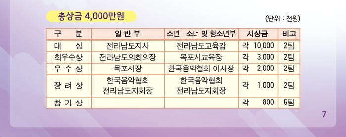 박우육 전남도 문화융성국장은 “앞으로도 전남지역 합창문화 활성화를 통한 도민의 문화예술 향유 기회 확대를 위해 최선을 다해 지원하겠다”고 말했다.