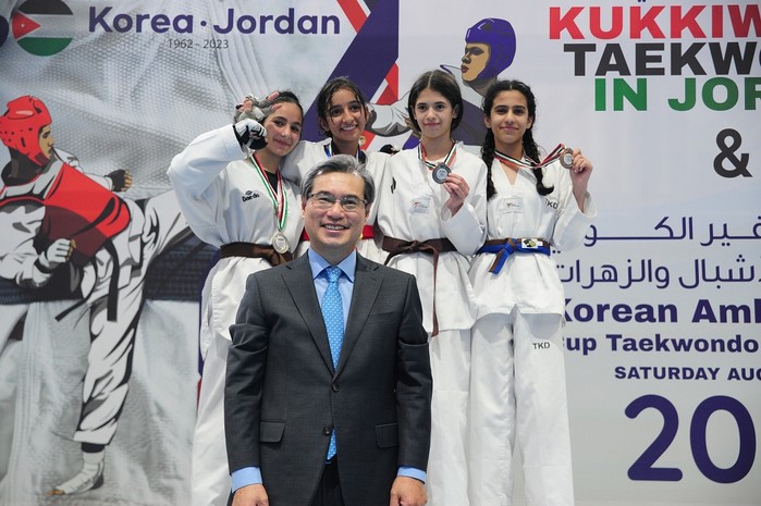 [프레스뉴스] 채정병 특파원=5일(현지시간) 요르단 암만에서 열린 주 요르단 대한민국 대사배 태권도 대회 카뎃 부분(12-14세) 시상식에서 김동기 주 요르단 대사가 여자부 수상자들과 함께 기념사진을 찍고 있다.