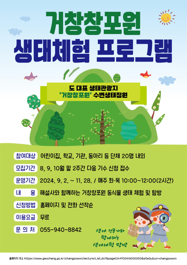 프로그램 신청은 8월 21일부터 거창창포원 홈페이지(geochang.go.kr/changpowon/)를 통해 가능하며, 자세한 사항은 거창창포원 운영담당(☎055-940-8842)로 문의하면 된다.