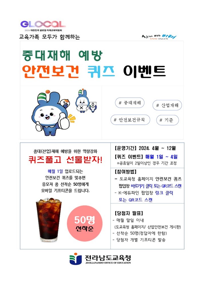 전남교육청 소속 기관 및 학교 전 직원이라면 누구나 참여할 수 있으며, 참여율을 높이기 위해 도교육청 홈페이지와 K-에듀파인 팝업창을 통해 운영한다. 매월 말 일 경 정답자 중 선착순 50명에게 모바일 커피 기프티콘을 지급할 예정이다.