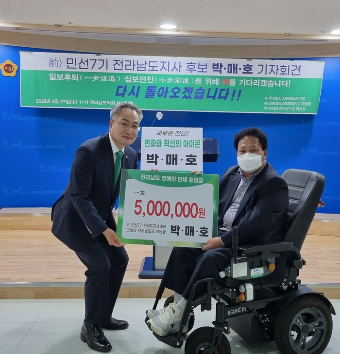 박 위원장은 예비후보자 등록비용을 의미 있고 뜻깊게 사용하고자 한다며 기자회견장에서 "코로나19로 누구보다도 힘들어 하고 계시는 도내 장애인분들께 작으나마 마음을 나누고 싶어 500만 원의 후원금을 전달했다.