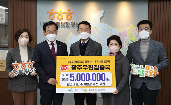 [광주=프레스뉴스] 강래성 기자= 광주우편집중국(국장 김종명)은 지난 23일 연말을 맞아 광주광역시 광산구청에서 배려계층 지원을 위한 500만원 상당의 후원물품을 전달했다.