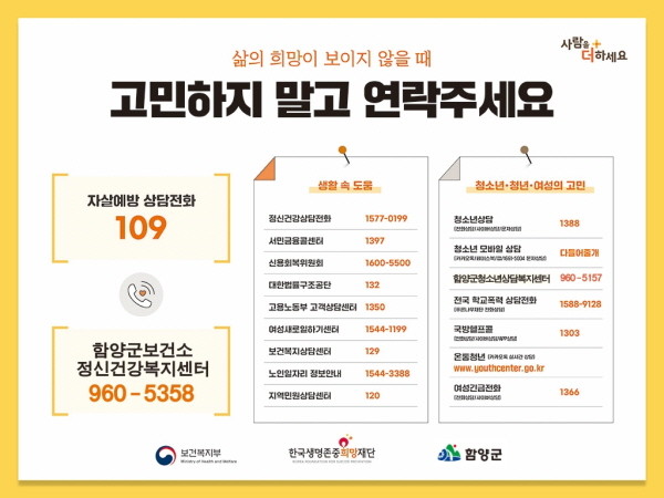 한편, 자살예방 상담전화 ☎109, 정신건강 상담전화 ☎1577-0199, 청소년 상담전화 ☎1388 등에서 24시간 전문가의 상담을 받을 수 있다.