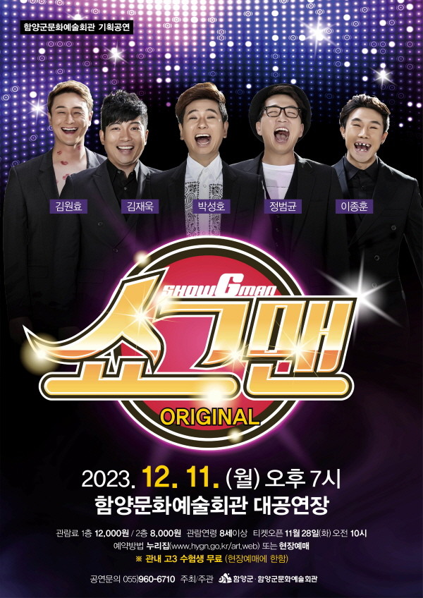 티켓 예매는 오는 28일 오전 10시부터 함양문화예술회관 누리집(12월 10일 17시까지)과 현장(문화예술회관 1층, 12월 11일 공연전까지)에서 1인 4매까지 가능하며, 관람료는 1층 12,000원, 2층 8,000원이다.