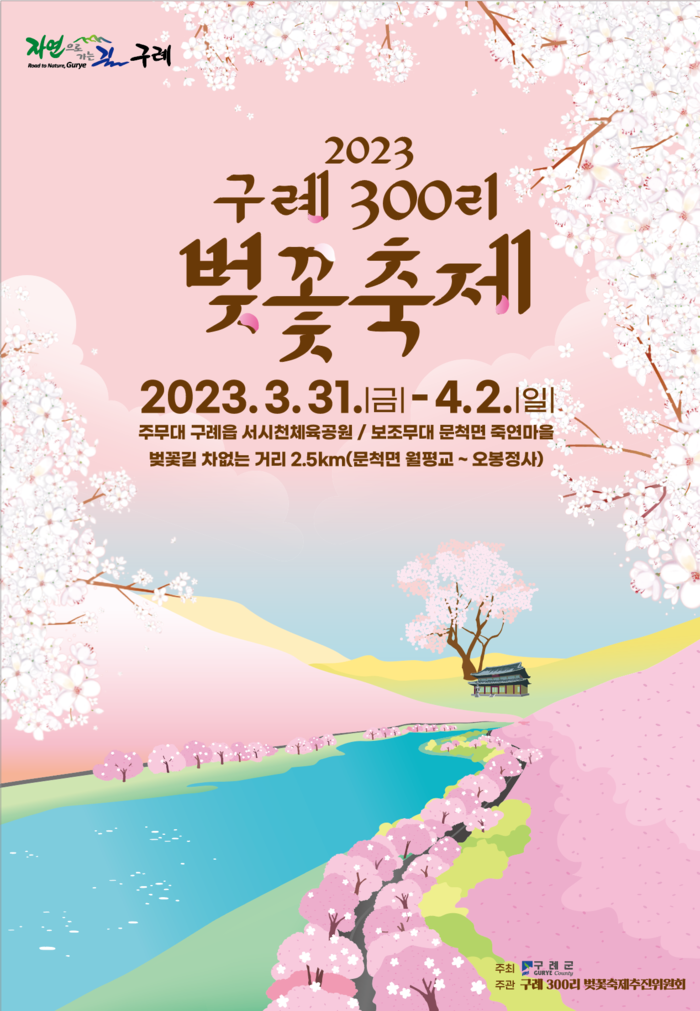 [전남=프레스뉴스] 강래성 기자= 전남 구례군은 기존 “섬진강변 벚꽃축제”를 군 단위 축제로 확대하여 3월 31일(금)부터 4월 2일(일)까지 3일간 “2023 구례300리 벚꽃축제”를 개최한다. 개막식은 3월 31일 오후 6시에 진행한다.