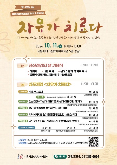 행사 참가 신청은 10월 8일까지 ‘시흥시정신건강복지센터 누리집’에서 하면 된다. 궁금한 사항은 시흥시정신건강복지센터 생명존중팀으로 문의하면 된다.