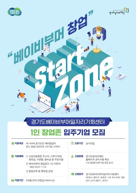 ‘1인 창업존(Start Zone)’ 입주기업 모집공고는 경기도일자리재단 누리집을 통해 확인할 수 있으며, 경기도베이비부머일자리기회센터에서 전화 및 방문 상담할 수 있다.