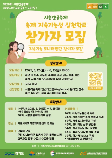 환경, 축제, 지속가능성에 관심 있는 시흥시민이라면 누구나 참여할 수 있다. 교육을 통해 축제의 환경적·사회적 영향을 측정하고, 지속가능한 축제 운영을 위한 개선 방안을 시민 스스로 도출하는 경험을 할 수 있다.