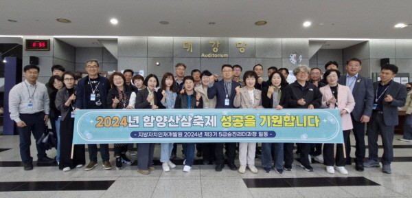 이에 교육 파견 중인 산삼축제 담당과장인 김복수 산삼항노화과장 외 7명의 교육생은 교육생 동기 500여 명과 고급·중견간부 200여 명 등 700여 명을 대상으로 함양산삼축제 홍보물을 나누어주고 2024년 제19회 함양산삼축제 성공개최 기원 퍼포먼스를 펼쳤다.