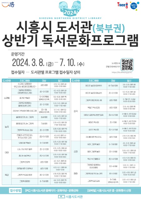 프로그램 참가 신청은 도서관별로 다르며, 자세한 내용은 ‘시흥시도서관 누리집 → 참여마당 → 도서관 소식 → 관별 프로그램 안내’를 참고하면 된다.