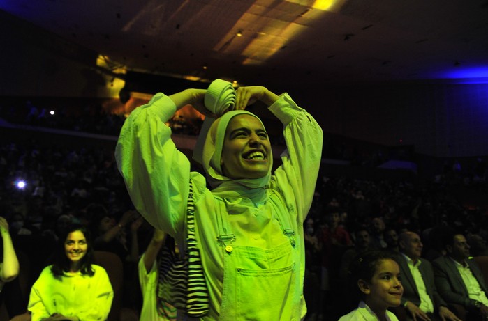 [프레스뉴스] 채정병 특파원=26일(현지시간) 한-요르단 수교 60주년을 기념하는 양국 공동 태권도 공연 행사가 암만 후세인 스포츠시티에서 열린 가운데 한 여성 관객이 K-타이거즈 단원들을 향해 하트를 날리고 있다.