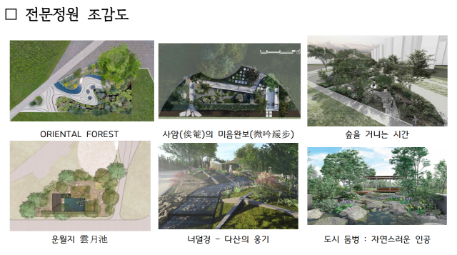 선정된 전문정원 작품은 ▲ORIENTAL FOREST ▲사암(俟菴)의 미음완보(微吟緩步) ▲숲을 거니는 시간 ▲운월지(雲月池) ▲너덜겅–다산의 웅기 ▲도시 둠벙 : 자연스러운 인공 이다.