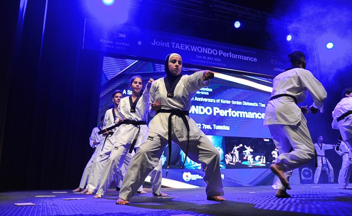 [프레스뉴스] 채정병 특파원=26일(현지시간) 한-요르단 수교 60주년을 기념하는 양국 공동 태권도 공연 행사가 암만 후세인 스포츠시티에서 열린 가운데 요르단 태권도 연맹 시범단이 시범공연을 하고 있다.