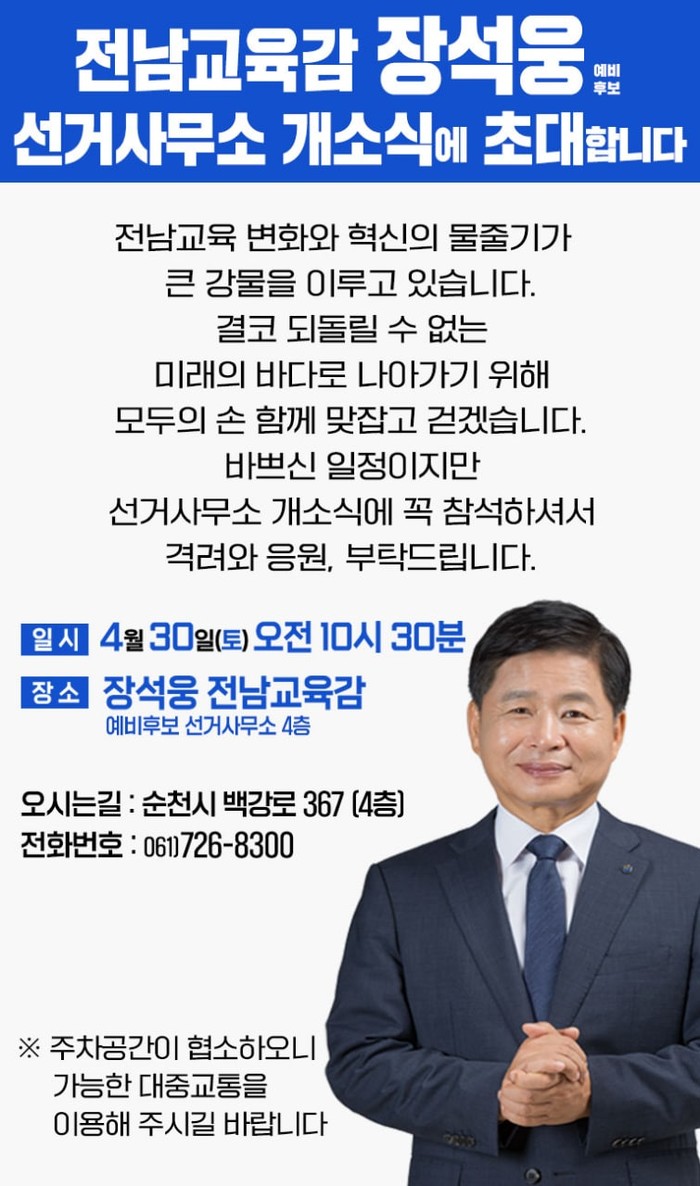 [전남=프레스뉴스] 강래성 기자= 전남교육감 재선에 나선 장석웅 예비후보가 30일(토) 선거사무소 개소식을 연다.