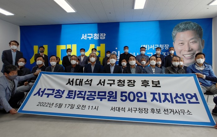 [광주=프레스뉴스] 강래성 기자= 서구청 퇴직공무원들이 서대석 서구청장 후보를 지지하고 나서는 등 6·1 지방선거 광주 서구청장 선거전이 더욱 뜨거워지고 있다.이환희 전 서구청 도시국장 등 서구청 퇴직 공무원 49명은 17일 쌍촌동 서대석 선거대책본부 사무소에 “일 잘한 구청장, 능력이 검증된 구청장인 서대석 후보를 서구청장으로 당선시켜 우리 서구를 더욱더 안전하고, 더불어 행복한 공동체로 만들어 주시기 바란다”며 지지선언을 했다.
