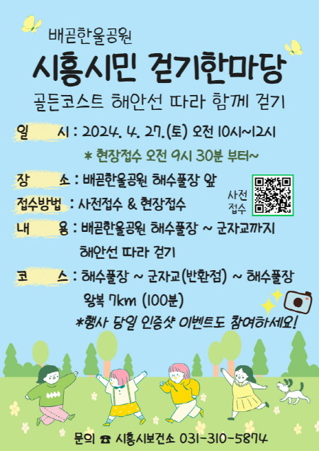 이번 걷기 한마당에서는 걷기에 대한 흥미와 참여를 높이기 위해 다양한 이벤트와 포토존을 운영할 예정이다. 걷기 코스는 배곧한울공원 해수풀장에서 시작해 군자교 아래를 지나 돌아오는 왕복 7km 코스로 진행된다.