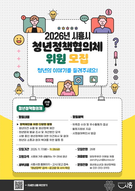 신청 기간은 11월 17일부터 28일까지이며, 시흥시에 거주하거나 생활하는 만 19세~39세 청년이면 누구나 지원할 수 있다. 협의체 위원에게는 위촉장 수여, 활동 지원비 지급, 시정 참여 확인서 발급, 우수 활동자 포상 등 다양한 활동 혜택이 주어진다.