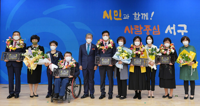 이날 기념식은 식전 현악4중주 문화공연을 시작으로 국민의례, 내빈소개, 구민헌장 낭독으로 이어졌으며, 주민 화합과 지역사회 발전에 기여한 숨은 일꾼에게 수여되는 서구민상을 시상했다.