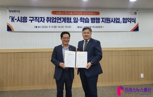 [프레스뉴스] 장현준 기자= 시흥시(시장 임병택)는 한국폴리텍대학 인천캠퍼스와 지난 9일 ‘K-시흥 구직자 취업 연계형, 일ㆍ학습병행 지원사업’에 대한 업무 협약을 체결했다.