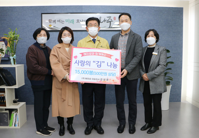 [나주=프레스뉴스] 강래성 기자= 나주시는 빛가람동에 위치한 김 제조업체인 ㈜해미로(대표 김삼문)에서 어려운 이웃을 위한 자사제품 김 50박스와 김자반 10박스(총 500만원 상당)를 기탁했다고 12일 밝혔다.