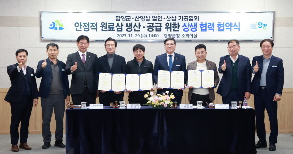 원료삼의 안정적인 생산과 공급을 통한 산양삼 가공산업 활성화를 위해 마련된 이날 협약식에는 진병영 함양군수와 김병익 함양산양삼협회 영농법인 대표, 이보성 중앙산양삼협회 영농법인 대표, 이종상 산삼가공협회 대표 및 군의회 의원과 관계 공무원 등 20여 명이 참석했다.