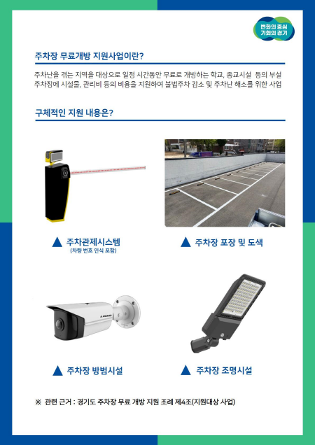 2019년부터 시작한 ‘경기도 무료개방주차장’은 시군과 협력해 주차장 20면 이상을 2년간 유지하고 하루 7시간, 주당 35시간 이상을 무료로 개방하면 부설주차장 무료개방에 필요한 시설 개선과 관리용도로 1곳 당 최대 1억 원(도비 보조금 50%, 시군비 50%)을 지원하는 사업이다.