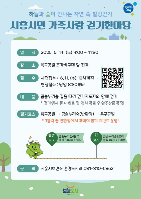 [프레스뉴스] 장현준 기자= 시흥시(시장 임병택)가 2025년 첫 번째「시흥시민 가족사랑 걷기한마당」을 6월 14일 옥구공원에서 개최한다.